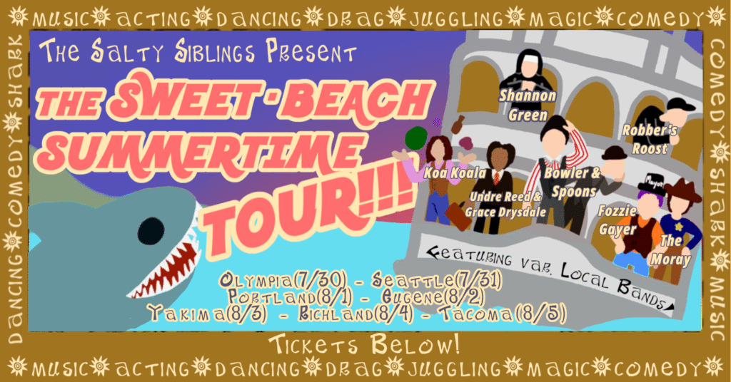 Home We’re not your parent’s vaudeville… 07/30 Olymia! 07/31 Seattle! 08/02 Eugene! 08/03 Yakima! 08/04 Richland! 08/05 Tacoma! …We’re Your Weird Aunts’ and Uncles’ Join our email list to be the first to get updates about the Salty Siblings!